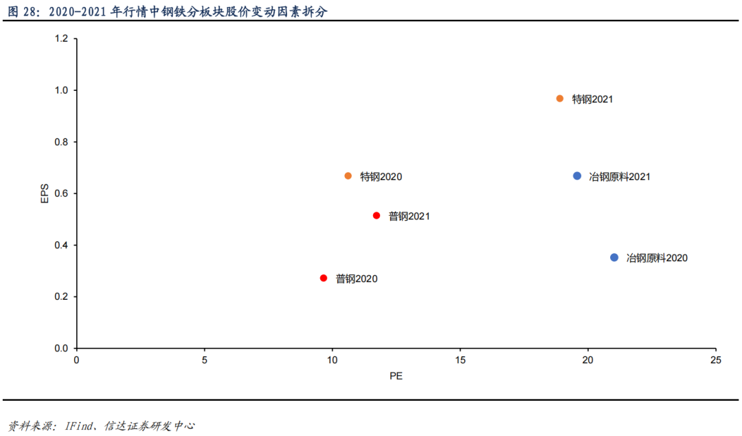 2020-2021 年行情中估值、利润增厚均对普钢、特钢板块股价上涨有正向贡献。以钢铁板块开启上涨通道的 2020 年 2 月起,钢铁板块各细分 EPS 增幅显著,其中冶钢原料、普钢涨幅显著分别为 90%、89%。同时,与 2016-2018 年行情不同,本轮行情中估值均对普钢、特钢股价上涨有正向贡献,PE 涨幅分别为 21%、78%。
