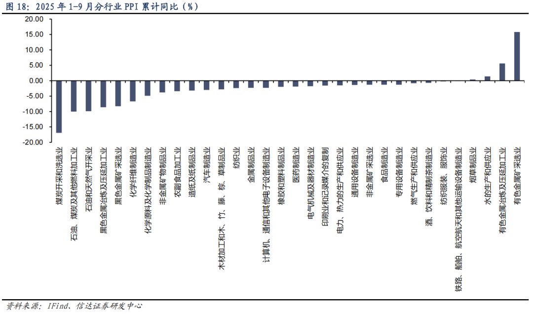 当前,受原材料价格下行及钢铁行业供需矛盾突出,钢铁 PPI 表现不佳,拖累整体 PPI。2025年 1-9 月,钢铁行业 PPI 累计同比-8.6%,在所有行业中处于较低水平,拖累了 PPI 的整体表现。