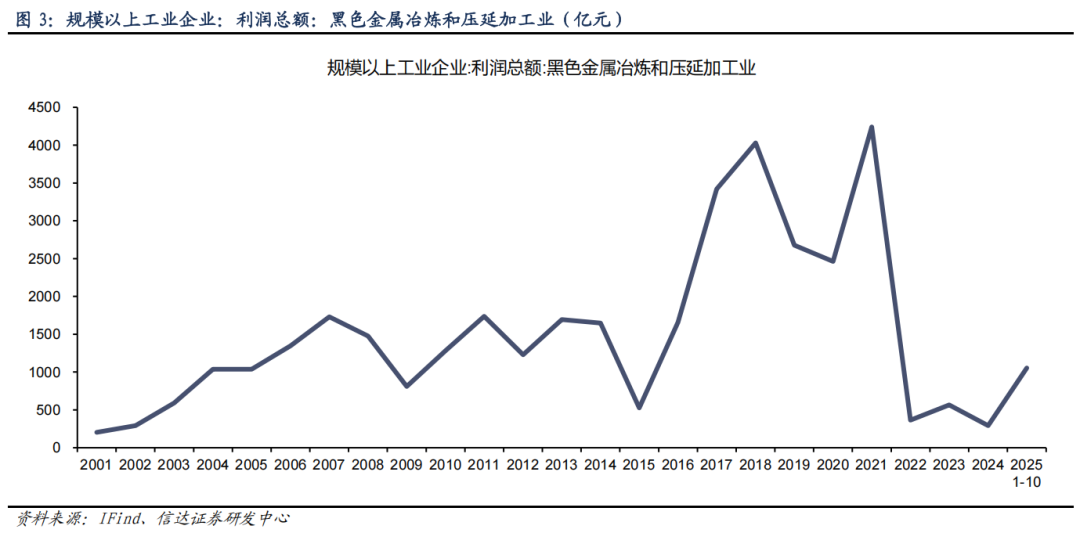 规上钢铁企业利润同步回升。2025 年 1-10 月,黑色金属冶炼和压延加工业规模以上工业企业利润总额为 1053 亿元,较 2024 年大幅改善。但需注意的是,当前行业利润修复态势仍低于上一轮供给侧改革。