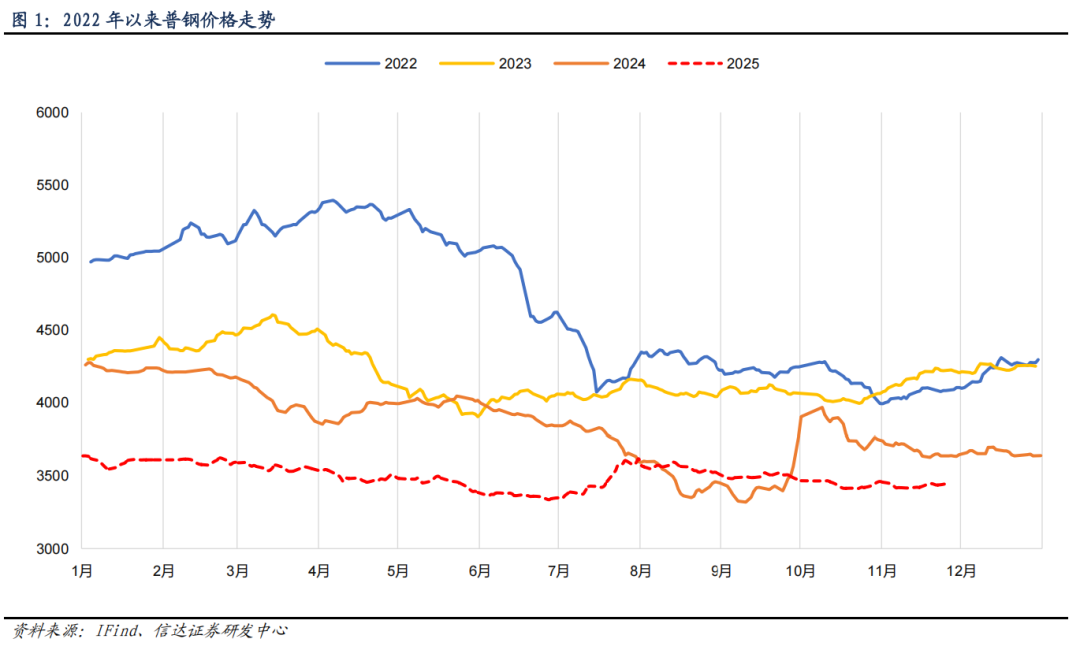 2025年钢价中枢继续下降,年初以来普钢价格整体呈前高后低。以普钢综合绝对价格指数为例,2025年钢价中枢进一步下探至3497元/吨(截至2025年11月24日),较2024年的3838元/吨有较大幅度下降,也是自2021年高点以来第4年中枢价格下移。2025年以来价格大概可分为三个阶段。第一阶段(年初至7月初):2025年初价格约3640元/吨,受需求弱现实、海外关税扰动以及原料端成本下移影响,需求偏弱叠加成本支撑转弱,价格重心逐步下移,7月初价格下跌至约3340元/吨。第二阶段(7月初至7月底):7月以来,受“反内卷”政策预期升温,叠加上游原料价格回升,钢价阶段性快速回升,7月底钢价已上涨至近3600元/吨。第三阶段(8月以来),随着7月底的修复高点后普钢钢材价格略有调整但整体震荡趋稳,截至2025年11月24日,普钢综合价格为3447元/吨,较年初高点仍下降约200元/吨。