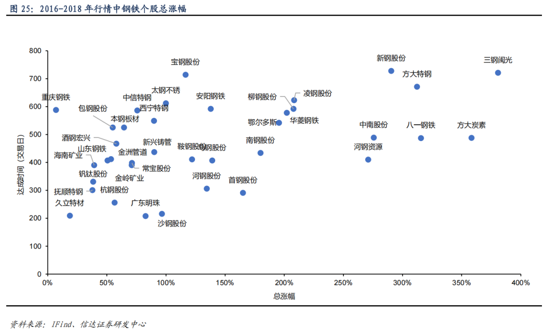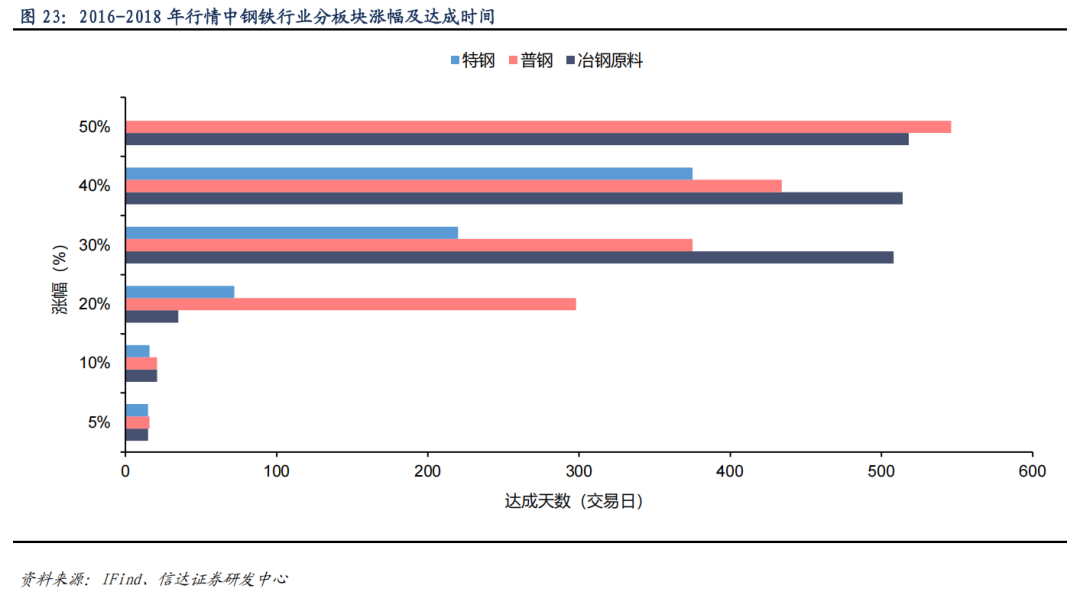 2016-2018年行情中,冶钢原料板块涨幅更大。2016-2018年的行情中,受供给侧改革带来的业绩共振,冶钢原料、普钢、特钢板块分别最高涨至193%、82%、44%。从达成时间来看,行情初期,冶钢原料板块涨势更快,行情的中后期,特钢板块涨势更快。