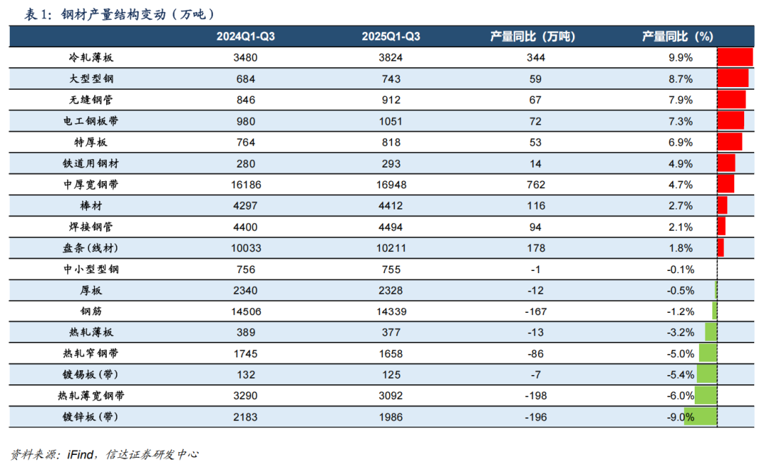 供给结构方面,制造业及建筑业用钢产量继续分化。2025 年 1-10 月,我国钢材产品结构中,冷轧薄板(9.9%)、无缝钢管(7.9%)、电工钢板带(7.3%)等制造业相关用钢品类产量同比增速居前。建筑用材钢筋产量同比继续下降,较去年同期下降约 1.2%。