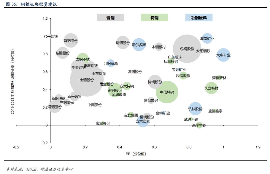 回顾 2016-2018 年及 2020-2021 年两轮 PPI 转正行情,我们发现,行情初期率先上涨的标的主要分布于中小市值区间。而贯穿整轮上涨,累计涨幅较大的标的主要分布于兼具业绩成长性及估值性价比区间,标的以普钢公司为主。若 PPI 转正,特别是后续有相应供给端、需求端政策出台后,我们认为,行情初期板块配置上重点关注特钢,在过去两轮行情中特钢板块行情初期上涨速度较快。贯穿整轮行情板块配置上重点关注普钢,板块业绩修复空间大,在过去两轮行情中普钢个股涨幅较高。个股选择方面,在不考虑公司自身的经营情况发生的重大改变,基于 2019-2021 年期间业绩成长性测算,我们认为,行情初期中小市值公司或率先上涨;行情中后期,兼具成长性与性价比的普钢公司或涨幅居前。