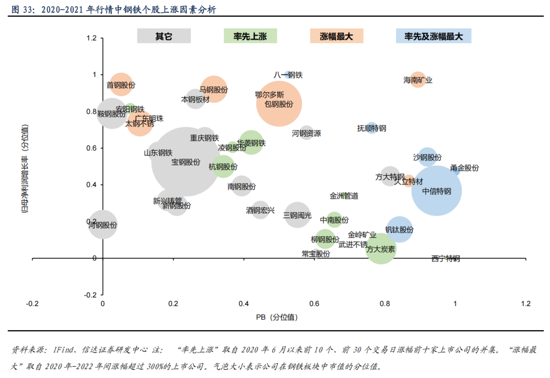 2020-2021 年行情中,中小市值的普钢标的率先上涨,业绩成长性较高的标的涨幅较大,普钢公司占比整体高于 2016-2018 年的行情。从估值、利润增长率、市值规模三个维度分析,在 2020-2021 年钢铁板块上涨行情中,率先上涨是以中小市值为主的普钢上市公司,如沙钢股份、杭钢股份、首钢股份、包钢股份等。在 2020-2021 年钢铁板块上涨行情中,涨幅居前主要是业绩成长性较高的钢铁上市公司,普钢公司占比仍较高,如八一钢铁、海南矿业、包钢股份、首钢股份、马钢股份等。