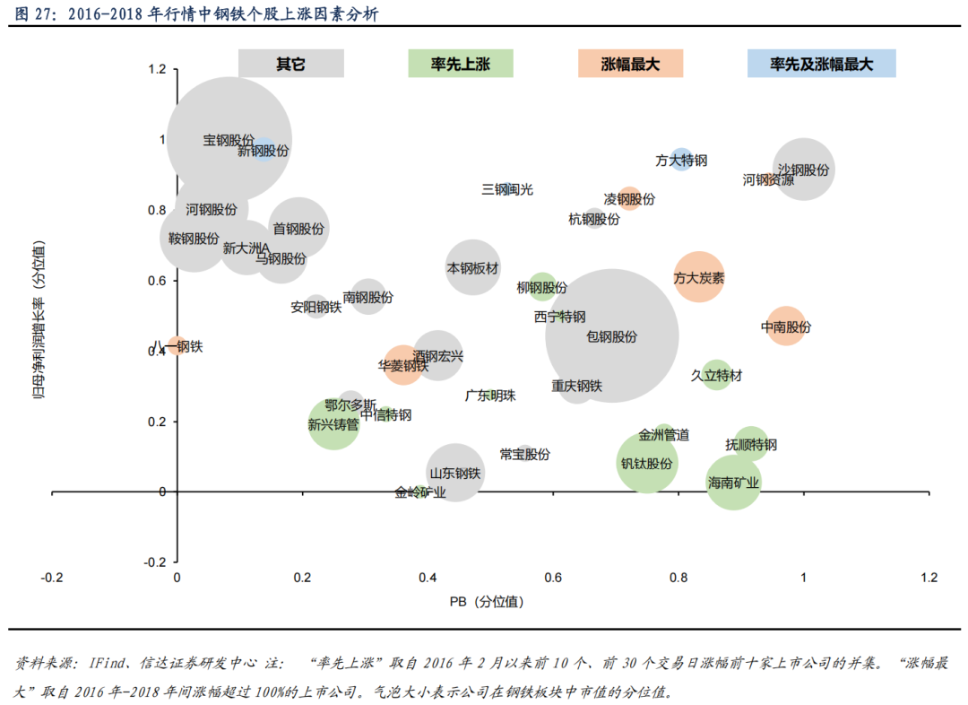2016-2018 年行情中,中小估值公司率先上涨,低估值的普钢公司涨幅较大。从估值、利润增长率、市值规模三个维度分析,在 2016-2018 年钢铁板块上涨行情中,率先上涨标的风格较为分散,但主要是中小估值的钢铁上市公司,以特钢及冶钢原料公司。在 2016-2018 年钢铁板块上涨行情中,涨幅最大主要是兼具盈利成长性和估值性价比的钢铁上市公司,以中小市值标的,其中普钢公司占比较率先上涨标的中的占比明显抬升。