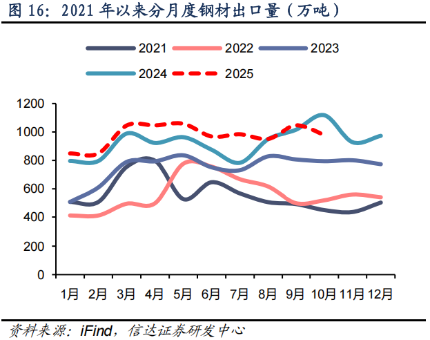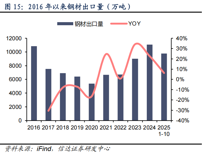 2025 年钢材出口超预期高位,贸易战负面影响有限。2025 年 1-10 月,我国实现钢材出口量9774 万吨,同比增长 6.4%,我们预计全年钢材出口量再次突破 1.1 亿吨,继续成为对冲钢材内需下降的中坚力量。