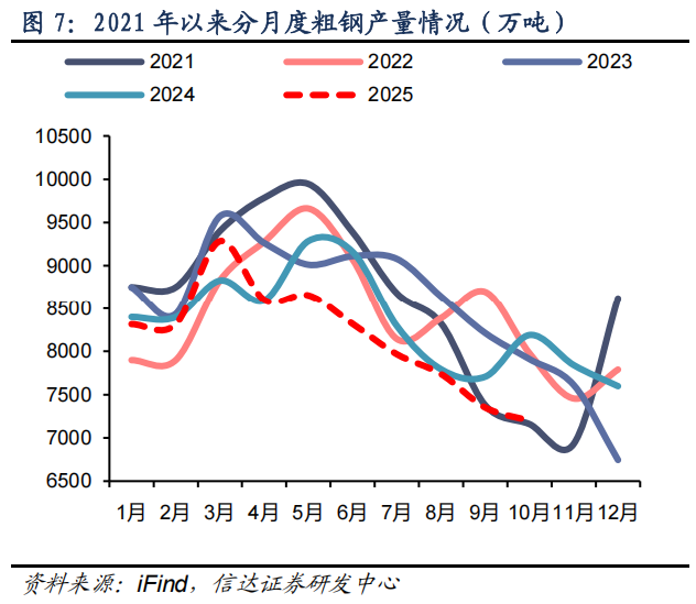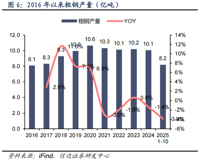 2025 年是粗钢产量平控实施的第 5 年,全年产量降幅或超 3%。2025 年 1-10 月,我国实现粗钢产量 8.2 亿吨,同比下降 3.9%。若产量趋势延续,全年粗钢产量降幅或超过 3%。分月份来看,2025 年粗钢产量呈现前高后低。