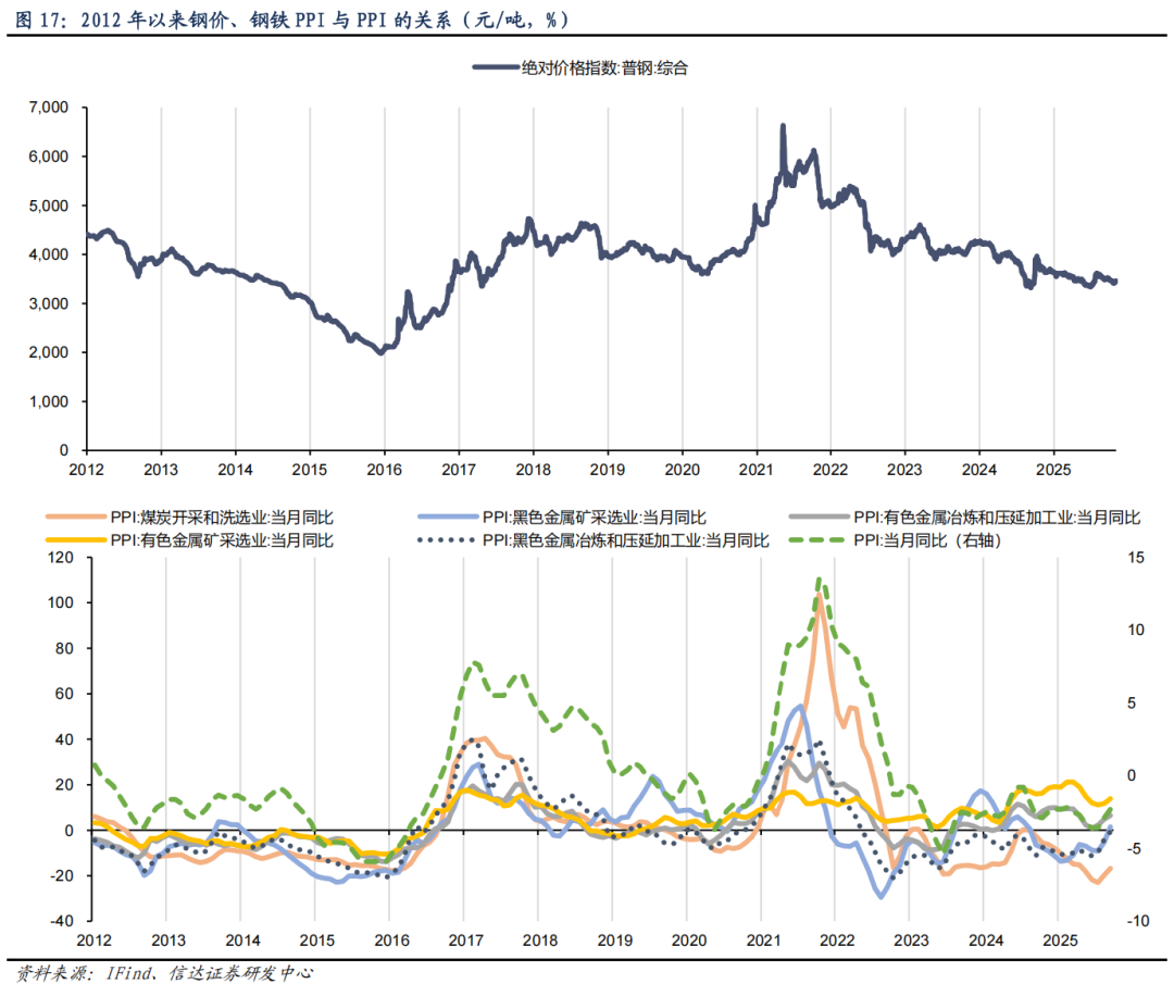 PPI 与钢铁 PPI、钢价趋势相似,波动更弱。从 PPI 视角来看,2012 年以来,PPI 同比与钢铁 PPI、钢材价格有较为显著的趋势相关性,特别是每当 PPI 转正时(如 2016 年、2021 年),钢铁作为传导能力较强的中游行业都在其中发挥重要作用。但需注意的是,钢铁行业作为中游制造业,其成品价格波动受上游煤炭、铁矿石等行业的较大影响,因此从趋势看,钢铁 PPI与煤炭、铁矿石等行业 PPI 走势有较高一致性。但从波动状态看,与煤价传导类似,钢价及钢铁 PPI 的波动幅度同样显著大于我国 PPI 的波动幅度,其原因主要是价格波动向 PPI 影响过程中产生损耗造成的。