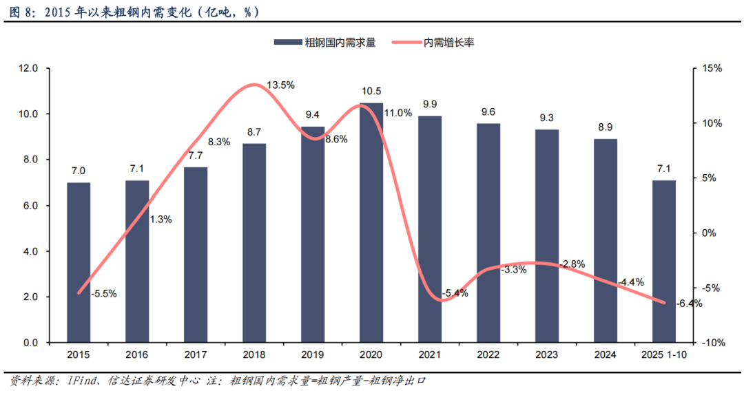 粗钢内需继续较大幅下降。2025 年 1-10 月,我国粗钢国内需求量为 7.1 亿吨,较去年同期的 7.6 亿吨下降 6.4%,整体降幅较 2024 年继续扩大。