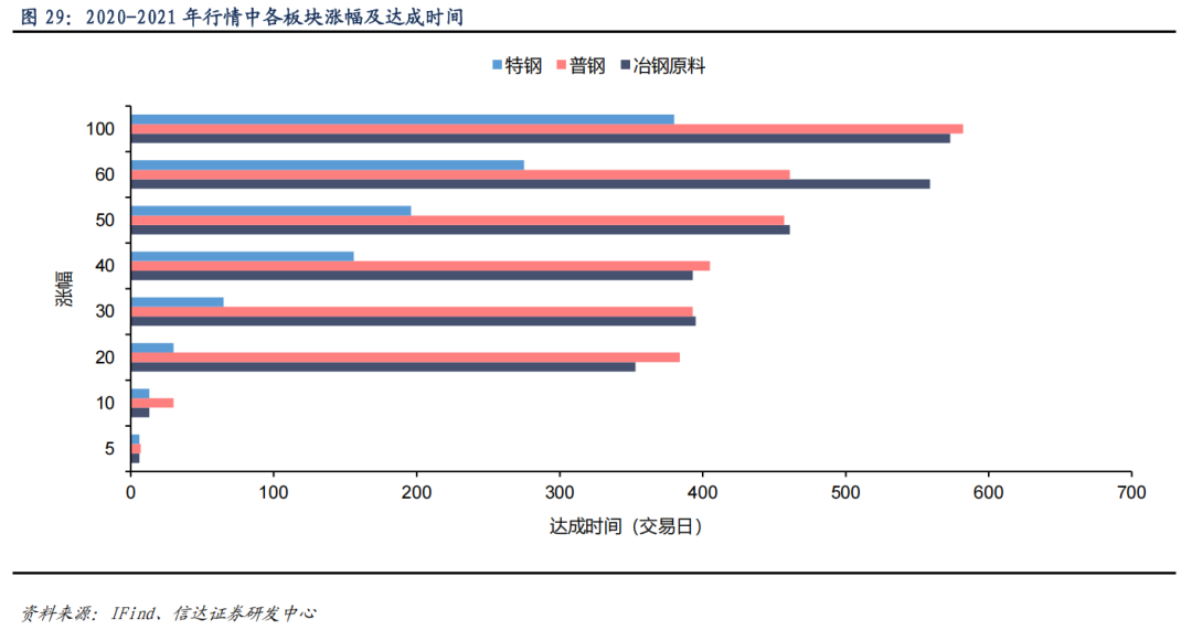 2020-2021 年行情中特钢板块涨幅更高、涨速更快。2020-2021 年行情中,受估值及业绩的共振,冶钢原料、普钢、特钢板块分别最高涨至 141%、128%、176%,特钢板块涨幅高于普钢板块。从达成时间来看,特钢板块涨势更快。