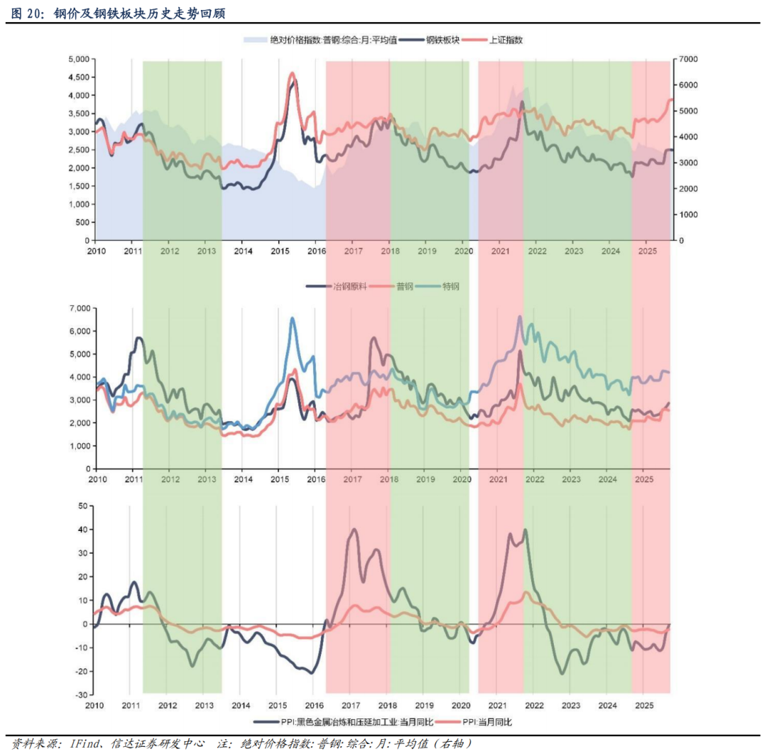 2010 年以来,历次行情中钢铁板块均对 PPI 的走势发挥了重要作用。分阶段来看,2011-2015年,受四万亿刺激政策效果减退后需求下滑,供给过剩,钢价逐步下行,钢铁指数跟随下行,PPI 于 2012 年转负。2014-2015 年,受金融市场牛市影响,钢铁指数快速上行,但同期钢铁板块仍受困于供需恶化,钢价仍处于下行区间,PPI 未转正。2016-2018 年,钢铁行业供给侧改革政策开始,行业过剩问题逐步解决,钢价底部回升,钢铁板块同步上行,PPI于 2016 年转正。2018-2020 年,2018 年,受资管新规出台影响,下游地产及基建需求转弱,钢铁板块震荡下行,钢材转跌,PPI 于 2019 年转负。2020-2021 年,货币宽松、疫情冲击及粗钢产量平控等因素叠加,钢快速上涨,钢铁指数同步上行,表现优于大盘,PPI 于 2021 年转正。2021-2024,钢铁板块受下游房地产需求拖累,叠加供给偏宽松,钢价整体下行,钢铁板块随之下跌。2024 年以来,受房地产需求边际下滑空间收窄,制造业用钢需求支撑以及钢铁行业“反内卷”的逐步推进,钢铁板块触底反弹。