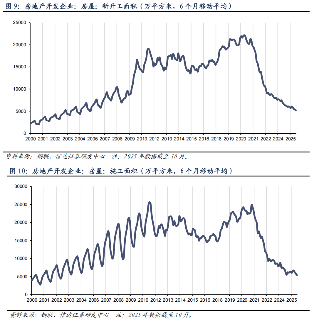 房地产方面,用钢需求继续下滑。从 2021 年中开始,房企频繁暴雷,房屋开工、施工面积急剧下滑。截至 2025 年 10 月,新开工面积、施工面积已分别降至 0.37、0.44 亿平方米。从趋势看,房地产新开工、施工面积仍处于下滑通道,但下降斜率有所放缓。