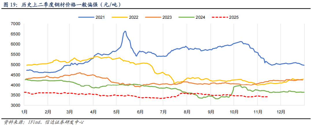 考虑今年的低基数及钢材价格趋势,钢铁 PPI 或在 2026 年二季度转正。2026 年,钢价价格预计在供给格局改善以及核心下游需求边际收窄的多重因素下,摆脱 2021 年以来的逐年下降趋势,止跌上行。此外,考虑当前钢材价格处于历史低位,在“反内卷”背景下钢铁供给总量有望收窄,钢价仍有较大的上涨空间。与之相对应,截至 2025 年 11 月 11 日,2025 年以来钢材指数中枢仅为 3500 元/吨,基本相当于 2017 年水平,是历史钢材的相对低点,且当前时点价格仅 3415 元/吨。因此,考虑 2025 年四季度钢价可能的上涨,并结合历史钢材价格中受“金三银四”驱动二季度整体偏强的季节性特征,我们预计钢铁 PPI 或在 2026 年二季度转正。