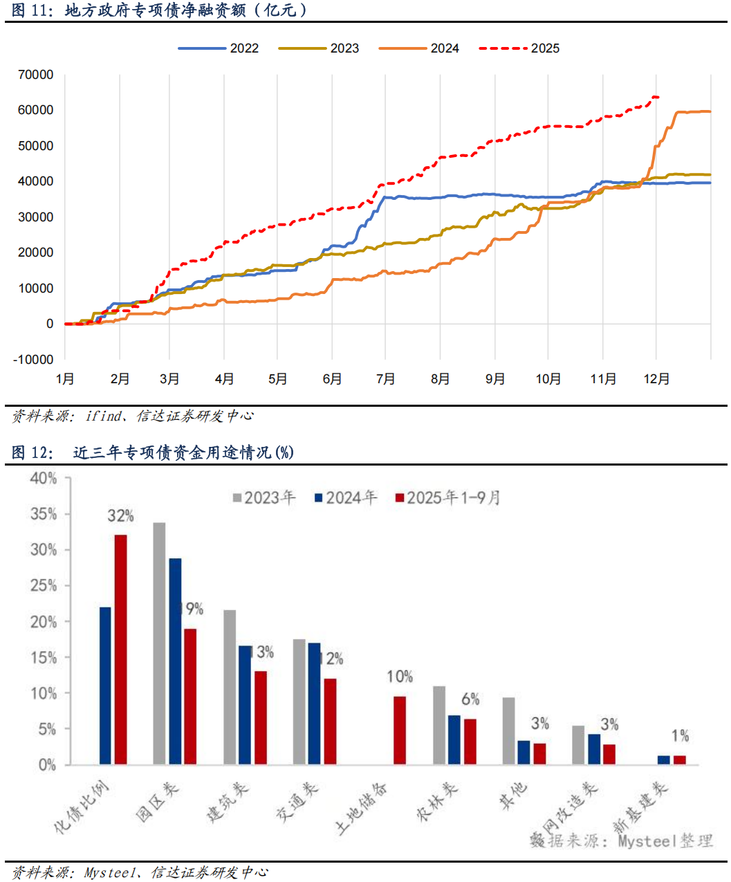 基建方面,地方专项债净融资额维持高位,传统“铁公基”投资比重下降。地方政府专项债净融资额持续维持高位,截至 12 月 1 日,地方政府专项债净融资额为 63615 亿元,累计同比增加27.51%。从用途数据来看,目前专项债的发行重点在化债方向,对于钢材消费量拉动
