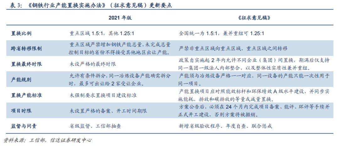 《征求意见稿》进一步收紧产能置换。(1)置换比例进一步提高,进一步突出减量置换理念。《征求意见稿》统一要求各省(区、市)炼铁、炼钢产能置换比例不低于 1.5:1,而 2021 年版则为重点区域 1.5:1,其他地区 1.25:1。(2)征求意见稿》提出“重点区域(京津冀及周边地区、长三角地区、汾渭平原)严禁新增钢铁产能总量,严禁从非重点区域向重点区域转移钢铁产能,严禁不同重点区域间转移钢铁产能。”(3)设产能置换最终时限,24 个月后将禁止非同一企业的置换。《征求意见稿》提出自实施起 2 年内允许不同企业(集团)间置换,期满后仅支持同一集一级法人内部整合,以及整体性实质性兼并重组。