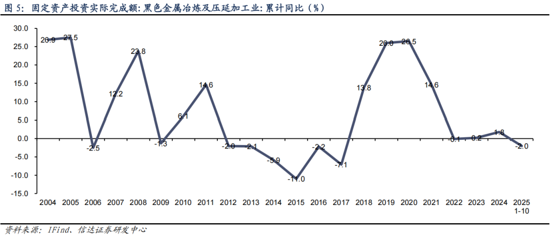 钢铁行业呈现供需双降、结构优化、盈利边际改善态势。供给端:总量收缩+结构分化,资本开支延续弱增态势。受“反内卷”政策导向、房地产行业下行及基建支撑力度有限等多重因素叠加影响,钢铁行业资本开支已连续四年放缓,2025年进一步陷入负增长区间。产量层面,1-10月,全国粗钢产量达8.2亿吨,同比减少3.9%,月度产量呈现明确的前高后低走势。结构分化特征显著,制造业用钢与建筑业用钢产量呈现反向变动,冷轧薄板(+9.9%)、无缝钢管(+7.9%)、电工钢板带(+7.3%)等高端制造类钢材产量增速居前,而建筑用钢筋产量同比下滑约1.2%,反映出行业供给结构向高附加值领域倾斜。需求端:内需持续收缩,专项债拉动效应边际减弱,出口成为重要拉动力。国内粗钢消费降幅持续扩大,2025年1-10月国内粗钢需求量为7.1亿吨,同比下降6.4%。传统用钢领域需求延续疲软态势:房地产与基建领域用钢需求持续收缩,2025年10月房地产新开工面积、施工面积分别降至0.37亿平方米、0.44亿平方米;尽管地方政府专项债净融资规模维持高位,但资金投向更侧重债务化解,对钢材消费的拉动效应显著减弱。出口已成为稳定钢铁行业运行的核心支撑力量。1-10月,我国钢材出口量达9774万吨,同比增长6.4%,我们预计全年出口量将再度突破1.1亿吨,有效对冲了内需下滑压力;同时,贸易环境变化未对出口形成显著制约,出口市场的韧性为行业供需平衡提供了重要保障。盈利端:煤焦钢产业链利润再分配格局下,钢铁行业盈利边际明显改善。2025年钢价中枢整体下移,普钢价格呈前高后低运行特征,截至2025年11月24日,普钢综合价格报3447元/吨,较年初高点回落约200元/吨。盈利端修复逻辑明确:受益于原料端焦煤和铁矿石价格的逐年回落,钢铁行业逐步脱离2022年以来的低位区间,2025年第三季度行业毛利率升至6.4%,处于2012年以来45%分位水平。从盈利规模来看,2025年1-10月,黑色金属冶炼和压延加工业规模以上工业企业利润总额达1053亿元,较2024年同期实现大幅增长。