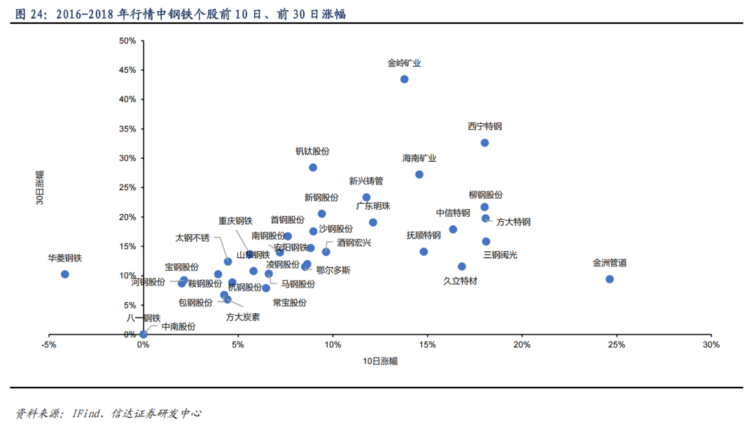 2016-2018年行情前期,率先上涨标的涨幅超过20%。2016-2018年行情中,金洲管道、三钢闽光、方大特钢、西宁特钢、柳钢股份、久立特材、中信特钢前10日涨幅突破15%,金岭矿业、西宁特钢、钒钛股份、海南矿业、新兴铸管、柳钢股份、新钢股份前30日涨幅突破20%,其中,金岭矿业前30日涨幅突破40%。
