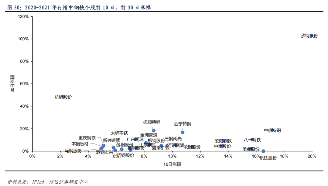 2020-2021 年行情前期率先上涨标的涨幅超过10%。2020-2021 年行情中,沙钢股份、中信特钢、钒钛股份、八一钢铁、甬金股份(维权)、安阳钢铁、中南股份、凌钢股份、方大炭素、西宁特钢前 10 日涨幅突破 10%,沙钢股份、杭钢股份、中信特钢、抚顺特钢、西宁特钢前 30 日涨幅突破 15%。