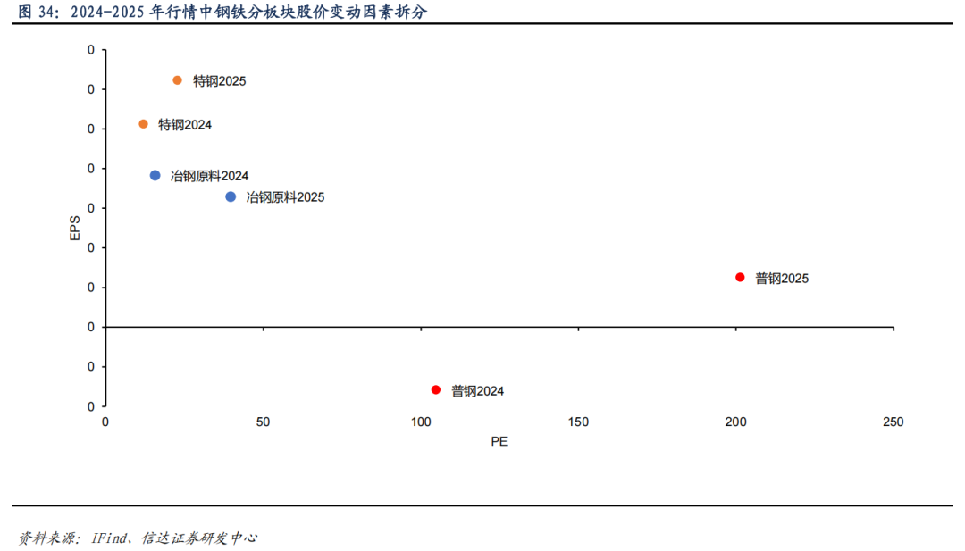 2024 年 9 月以来,在宏观政策加力与行业“反内卷”持续推进的背景下,钢铁板块整体呈现修复态势。从盈利修复程度看,普钢板块表现尤为突出,EPS 增幅达 180%,大幅高于特钢板块 21%的增幅。估值方面,各子板块均迎来抬升,普钢、特钢、冶钢原料的 PE 增幅分别达到 92%、91%和 153%。