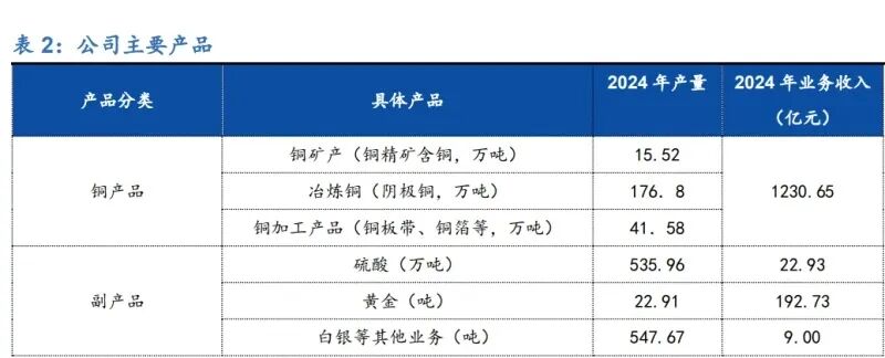 公司核心业务分为矿产产品、冶炼铜、铜加工产品和副产品。 矿产层面,2024 年公司自产铜精矿含铜 15.52 万吨,铜矿自给率 8.78%,仍有较大 的铜矿需求空间。截至 2024 年年末,企业铜资源金属量为 721.81 万吨,其中:米 拉多铜矿 70%权益保有铜资源金属量 456 万吨,铜平均品位 0.49%,国内冬瓜山铜 矿、安庆铜矿、铜山铜矿等矿山合计 265.81 万吨。米拉多矿二期完全投产后,预期 年产铜精矿含铜可突破 30 万吨,一定程度降低铜矿对外依赖度。国内矿山近年则聚 焦绿色化改造,在年总产能维持 5 万吨的背景下,冬瓜山铜矿、安庆铜矿、庐江矿业 获国家级绿色矿山。 冶炼层面,公司2024年年产阴极铜176.80万吨,约占国内精炼铜总产量的12.96%, 25 年铜基新材料产线投产后,企业冶炼产能将突破 200 万吨/年。企业选位上,旗下 冶炼厂多分布在长江沿岸,江海港口、高速公路、铁路干线等交通网络沿线,原材料 运输成本显著低于行业平均水平,且贴近华东市场,在销售渠道上具备一定优势;工 艺设备上,企业冶炼厂已经完成了“双闪工程”和“奥炉改造工程”建设,实现了冶 炼绿色智能化转型;冶炼产能上,在赤峰金通二期项目和绿色智能铜基新材料产业园 一体化项目建成投产后,企业冶炼产能规模将进一步增长。 精深加工层面,铜加工材年产量 41.58 万吨,其中高精度电子铜箔产能突破 8 万吨。 子公司铜冠铜箔在行业内拥有先进的研发实力和技术积累。公司自主研发的 HVLP 铜箔,具有低的表面轮廓度,传送信号损失低,阻抗小等优良介电特性,打破国外技 术和产品双向垄断。 副产品方面,公司全年生产硫酸 535.96 万吨、黄金 22.91 吨、白银 547.67 吨。同 时,公司以硒、碲等冶炼伴生稀散金属回收、高值化利用为攻关核心,先后开发出 6N 级高纯碲、高纯铟等 17 种新产品。
