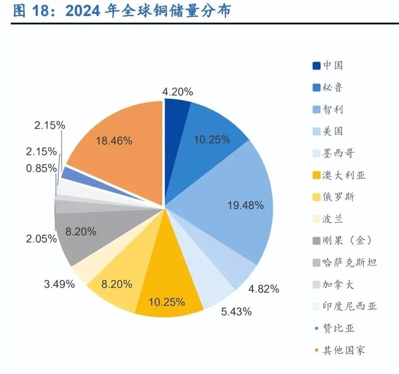 全球铜储量增速下降,资源集中在少数国家。2024 年,世界铜储量 98000 万吨,同 比下降 2%,近五年复合增长率为 3.02%,整体处于低速增长水平。相较于 2014- 2019 年,年均复合增长率下降了 1.82 个百分点,增速明显放缓。资源分布上,铜储 量主要分布在南美洲和大洋洲,地域集中度高,前五大资源国控制了全球约 57%的 铜矿资源量。其中,智利铜储量占全球 19.48%,稳居第一;澳大利亚和秘鲁并列第 二,占比 10.25%。
