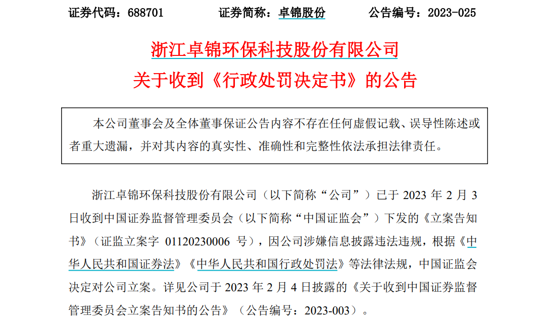 2023年2月3日,卓锦股份因涉嫌信息披露违法违规,被中国证监会立案调查。