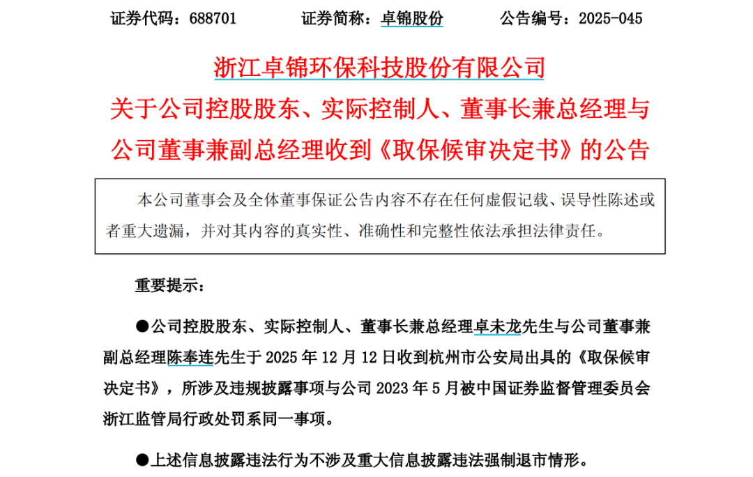 12月15日,卓锦股份发布公告称,公司控股股东、实际控制人、董事长兼总经理卓未龙与公司董事兼副总经理陈奉连收到杭州市公安局出具的《取保候审决定书》,所涉及违规披露事项与公司2023年5月被中国证券监督管理委员会浙江监管局行政处罚系同一事项。根据《中华人民共和国刑事诉讼法》第六十七条的规定,杭州市公安局决定对其取保候审,期限自2025年12月12日起算。