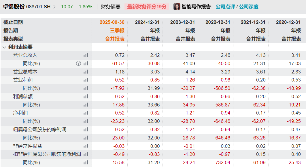 业绩方面,卓锦股份前三季度实现营业收入7160.17万元,同比减少61.57%;归属于母公司所有者的净亏损为5216.05万元,亏损扩大。