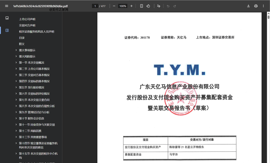 根据最新披露的收购公告,上市公司广东天亿马信息产业股份有限公司拟通过发行股份及支付现金的方式,收购星云开物合计98.5632%股权。以评估基准日测算,星云开物100%股权评估值约为12.1亿元,对应本次交易作价约11.89亿元。交易完成后,星云开物将成为上市公司天亿马的控股子公司。