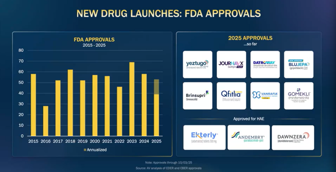 还有三款新药我特别关注,它们都用于治疗遗传性血管性水肿(HAE)这一罕见病。20 年前我刚入行时,我们公司最早评估的项目之一就是针对HAE,那时还没有任何获批药物。17年后的今天,Dawnzera 成为第11款获批用于治疗HAE的药物,为患者、照护者和医生应对这种疾病提供了丰富的治疗工具。