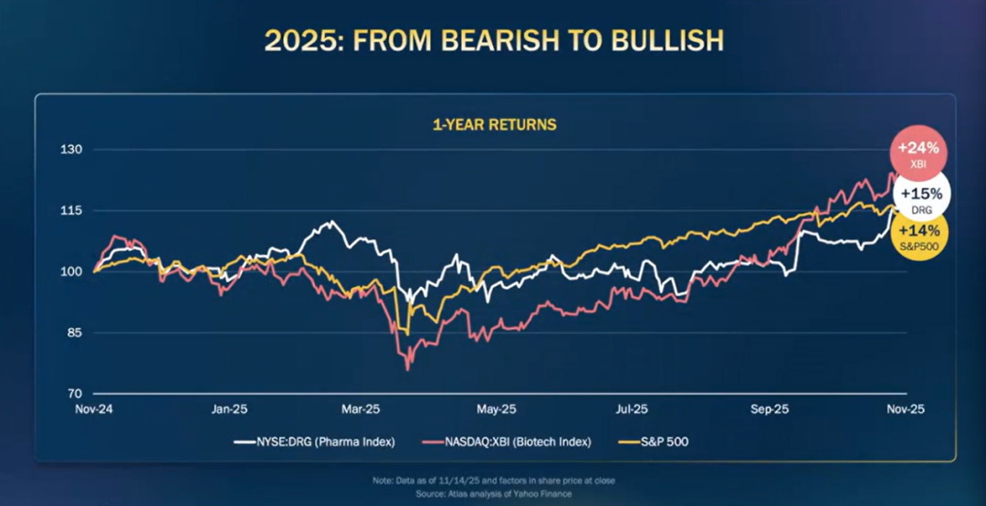 相较于此,美股生物制药板块受制于宏观环境波动,走势和估值水平一度陷入低迷。直到第四季度,得益于宏观风险消散、投资者“避险”AI热潮,以及制药企业的强劲盈利表现,板块整体才有所回弹。