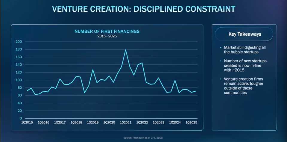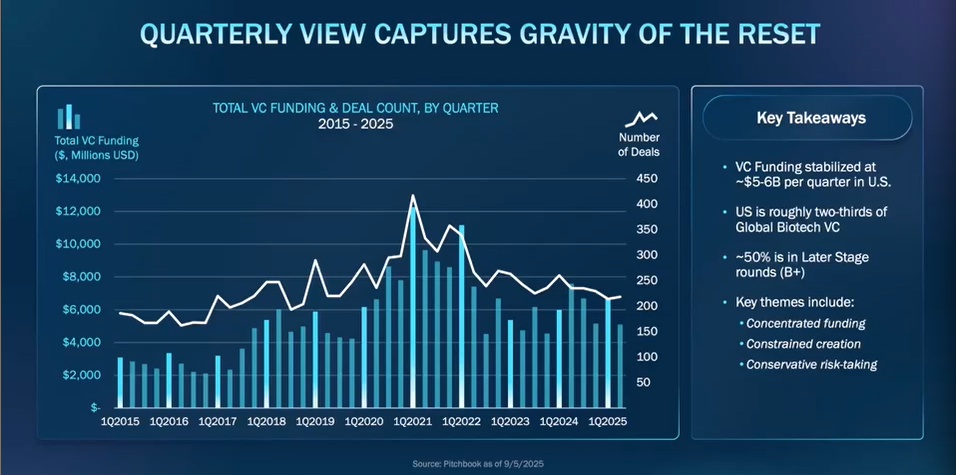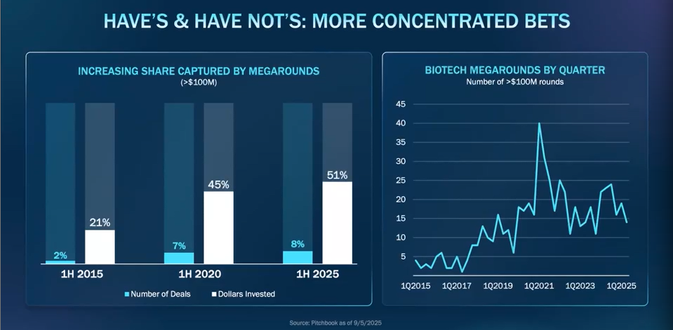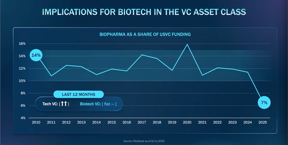 我们看到,2025年,生物科技领域占风险投资“蛋糕”的比例首次降至中个位数。部分原因是AI和机器学习相关的科技投资激增。