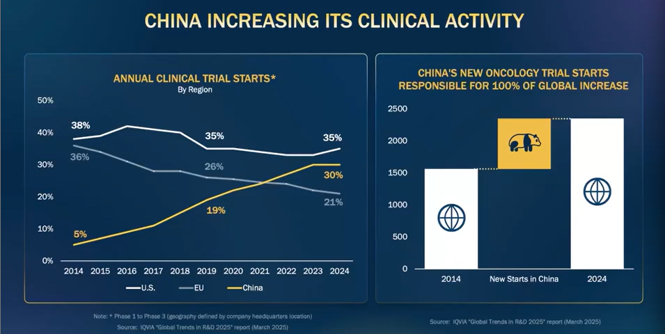 这很大程度上是因为中国在全球生物医药创新生态体系中的地位不断提升。十年前,全球仅有5%的临床试验在中国启动,如今这一比例已升至30%,与美国基本持平。而2010年至今全球肿瘤临床试验数量的增量,全部来自于中国启动的研究项目。