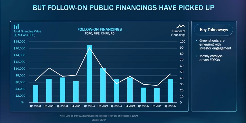 积极信号已经出现:基于利率趋于明朗、宏观风险消退、FDA政策趋向稳定,以及一批积极的临床数据陆续公布,市场情绪正逐步向好。投资者参与进来,部分综合型投资者也重返这一领域。大多数再融资由利好催化驱动,也不乏一些企业抓住这个窗口期完成募资。未来6~9个月,我们行业或将迎来一段颇具活力的发展期。