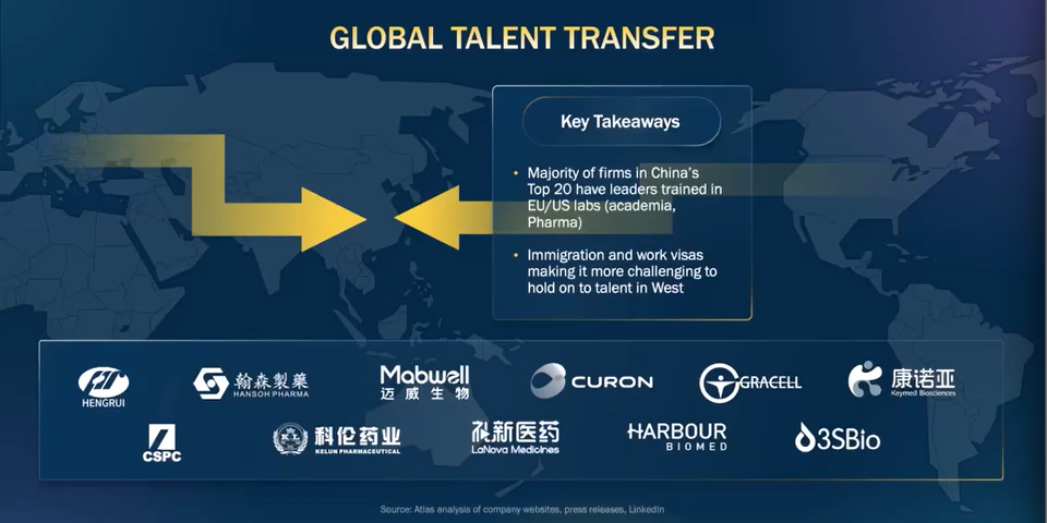 双向流动的不只有医药资产与资金,还有专业人才。我们调研了中国排名前20 的新兴生物制药企业,发现这些企业的管理团队里,有一名甚至多名核心领导者拥有西方背景。他们要么接受过西方学术教育,更常见的是曾在西方制药企业担任过管理职务。