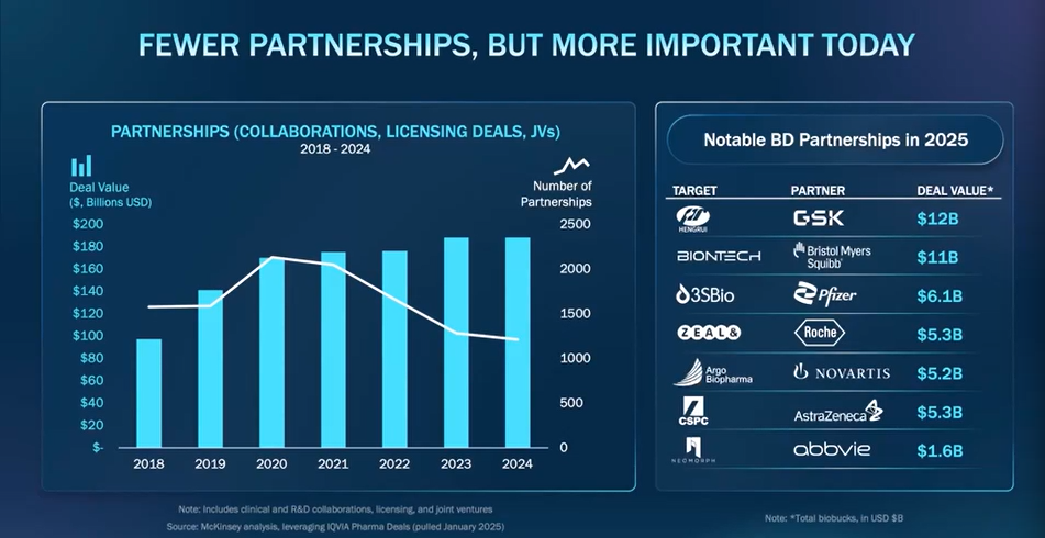这一态势推动了空前活跃的东西方医药合作交易。中国药企参与了今年全球约1/3的医药授权合作交易,相关交易总价值超1300亿美元。这类合作既有NewCo,像我们与恒瑞医药合作成立Kailera,更多的是传统的授权引进(license-in)模式。