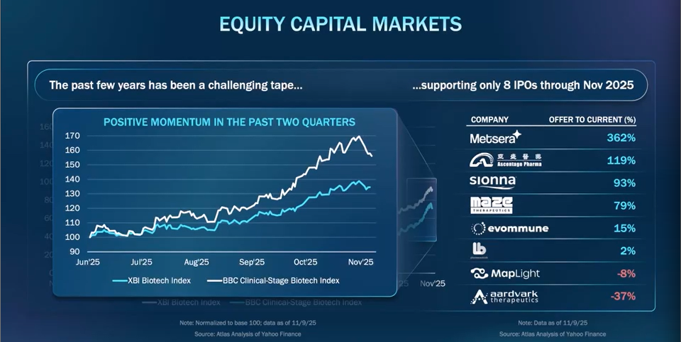 我预计这种情况将会改变。市场对生物科技公司IPO的兴趣已明显提升,毕竟过去六个月里,生物科技市场大幅反弹——BBC指数在这期间上涨了60%~70%,XBI指数在今年春季触底后也已回升30%~40%。