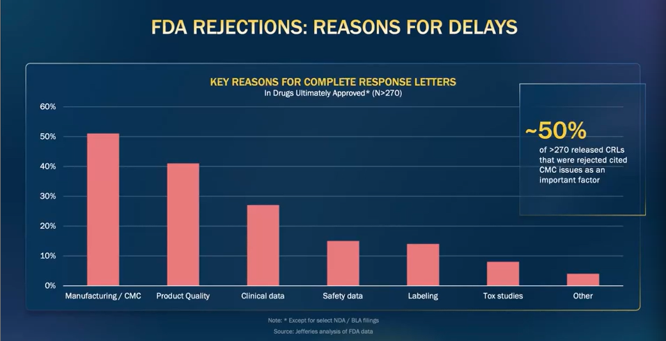 审批延迟也会影响药品的销售曲线。今年夏天,FDA发布了270封完整回应函,阐明了多款药物延迟审批的原因。这些药物最终大多获批上市,但其中50%因为制造和化学、生产和质量控制(CMC)的问题收到信函。我想提醒所有生物技术公司的首席执行官:这或许是最无聊的部分,但绝不能低估在这方面投入的重要性。