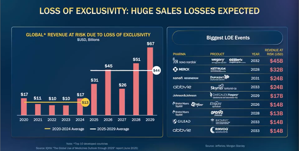 与此同时,行业也面临着一些“逆风”,包括临床试验失败、监管机构的审批驳回或延迟,以及已上市药品的专利到期等。