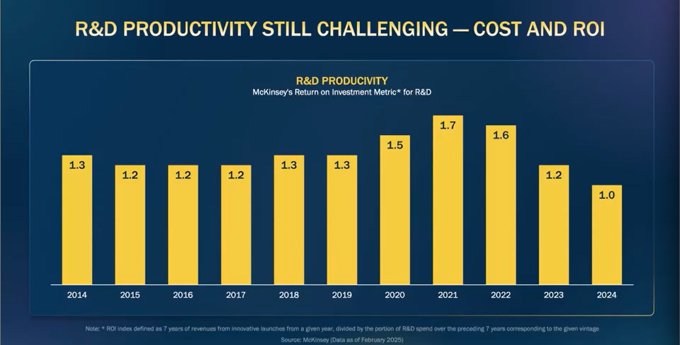 成本上,以研发生产力的投资回报率来看,2024年是过去十余年里研发生产力投资回报率最差的一年。此前新冠疫情与部分GLP类药物研发曾带来短暂的回升。