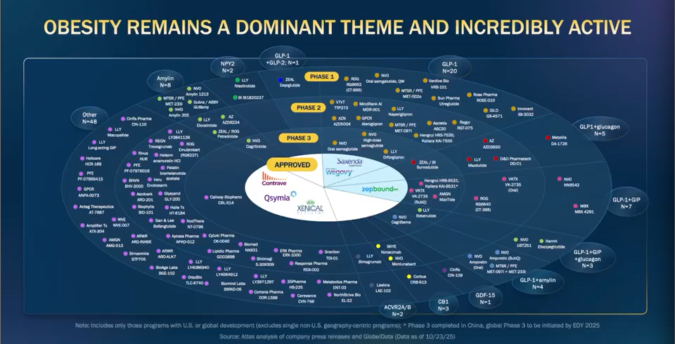 第二个核心议题是肥胖症。下图中,中心区域代表已获批药品,外围则是处于临床阶段的在研项目。可以看到,肥胖症领域的研发热度极高,其中约1/3的项目聚焦于GLP及肠促胰素相关通路。就新药对健康的影响而言,这或许是我们这个时代最重要的一条药物作用通路。