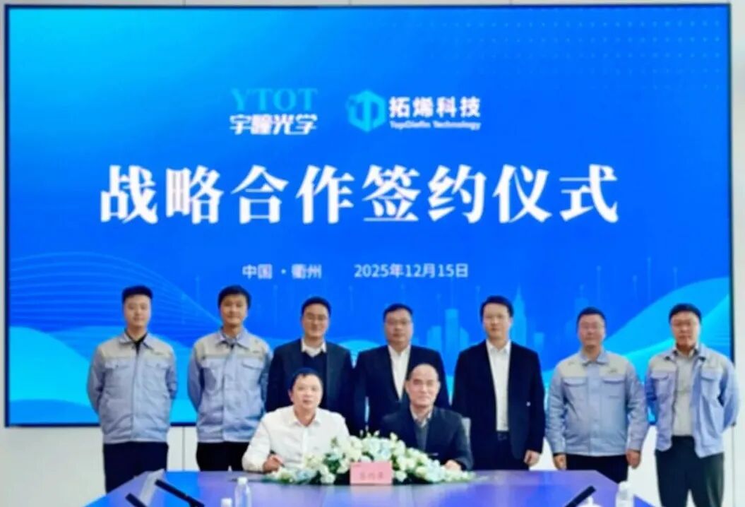 12月16日,宇瞳光学与拓烯科技正式签署深化战略合作协议,标志着双方长期紧密的合作关系迈向全新阶段。宇瞳光学总经理金永红、财务中心总经理管秋生、研发技术中心副总经理何剑炜,与拓烯科技董事长王董及高管团队共同出席并见证了签约仪式。