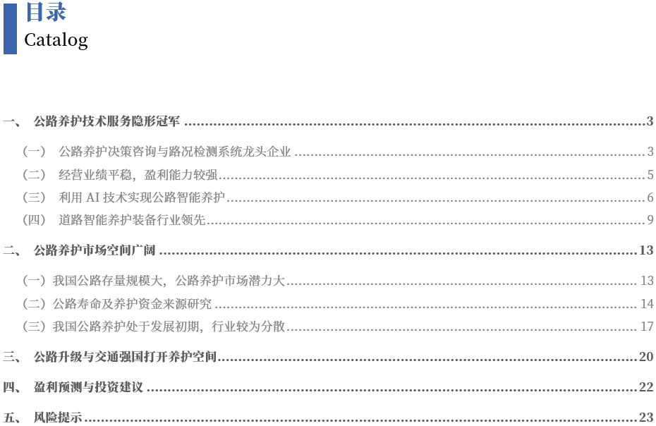 人工智能技术赋能公路养护,交通强国建设助成长。公司信息化平台覆盖公路智能养护全生命周期。公司利用人工智能技术实现路面病害自动识别、道路结构损伤智能探测及精准修复。公司道路智能养护装备行业领先,能实现路面病害自动识别、异常数据的诊断与处理等。《交通强国建设纲要》提出,到2035年,基本建成交通强国。基本形成两个“全国123出行交通圈”和“全球123快货物流圈”。公路升级和交通强国建设持续打开公路养护成长空间。