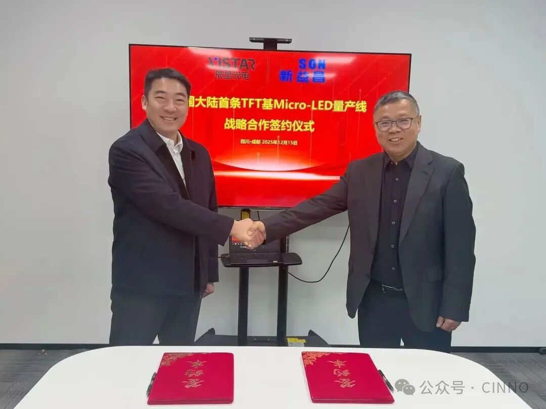 12月17日,玻璃基Micro-LED(COG-基于TFT背板的玻璃基 Micro-LED 技术)领军企业辰显光电与高端半导体装备制造商新益昌正式签订战略合作框架协议。双方将聚焦玻璃基Micro-LED芯片巨量转移这一核心工艺环节,共同攻克技术瓶颈,展望其在商业显示、智慧会议、透明显示、车载显示等广阔场景的应用前景,携手破解行业量产化与成本优化的核心痛点,共赴千亿蓝海市场。