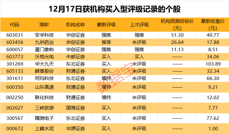 据证券时报 数据宝统计,今日机构研报共发布12条买入型评级记录。其中,安孚科技、九洲药业、厦门象屿机构发布的预测目标价为51.3元/股、26.64元/股、11.13元/股,距离最新收盘价的上涨空间分别为25.83%、 48.99%、30.79%。