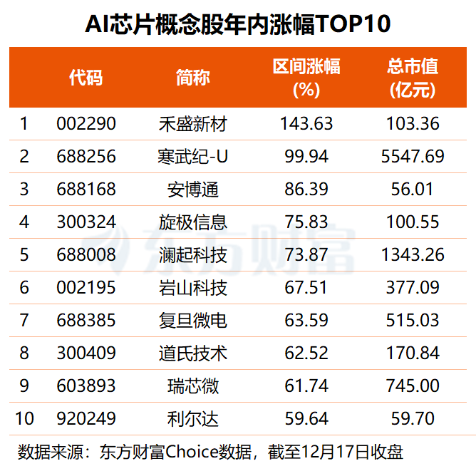 东方财富题材板块显示,除了沐曦股份与摩尔线程两只新股,目前A股市场共有36股涉及AI芯片概念,合计总市值约1.90万亿元,近九成个股年内股价实现上涨,其中,禾盛新材以143.63%的涨幅居首,寒武纪也涨约1倍,旋极信息、澜起科技、复旦微电等11股涨幅均在五成以上。