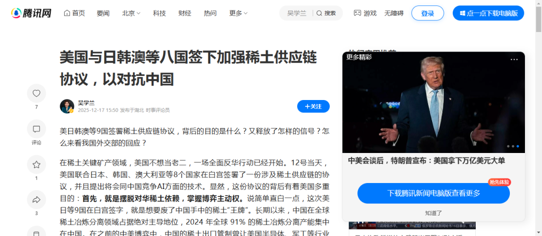 最后,满足美国国内政治与利益需求。当前对华强硬是美国政坛的主流论调,特朗普政府此前因与中国就相关问题谈判,被部分民众和反对党解读为对华软弱。这次牵头搭建稀土供应链,既能向国内展示对华强硬的姿态,压制反对声音,还能通过推动稀土相关产业合作,带动国内相关产业发展,赢得相关利益群体的支持。
