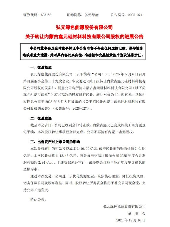 12月15日,弘元绿能(603185)公告称,公司于2025年5月6日召开第四届董事会第二十九次会议,审议通过《关于拟转让内蒙古鑫元硅材料科技有限公司股权的议案》,同意公司将所持内蒙古鑫元硅材料科技有限公司(简称“内蒙古鑫元”)27.0737%的股权进行转让,转让对价为12.45亿元。