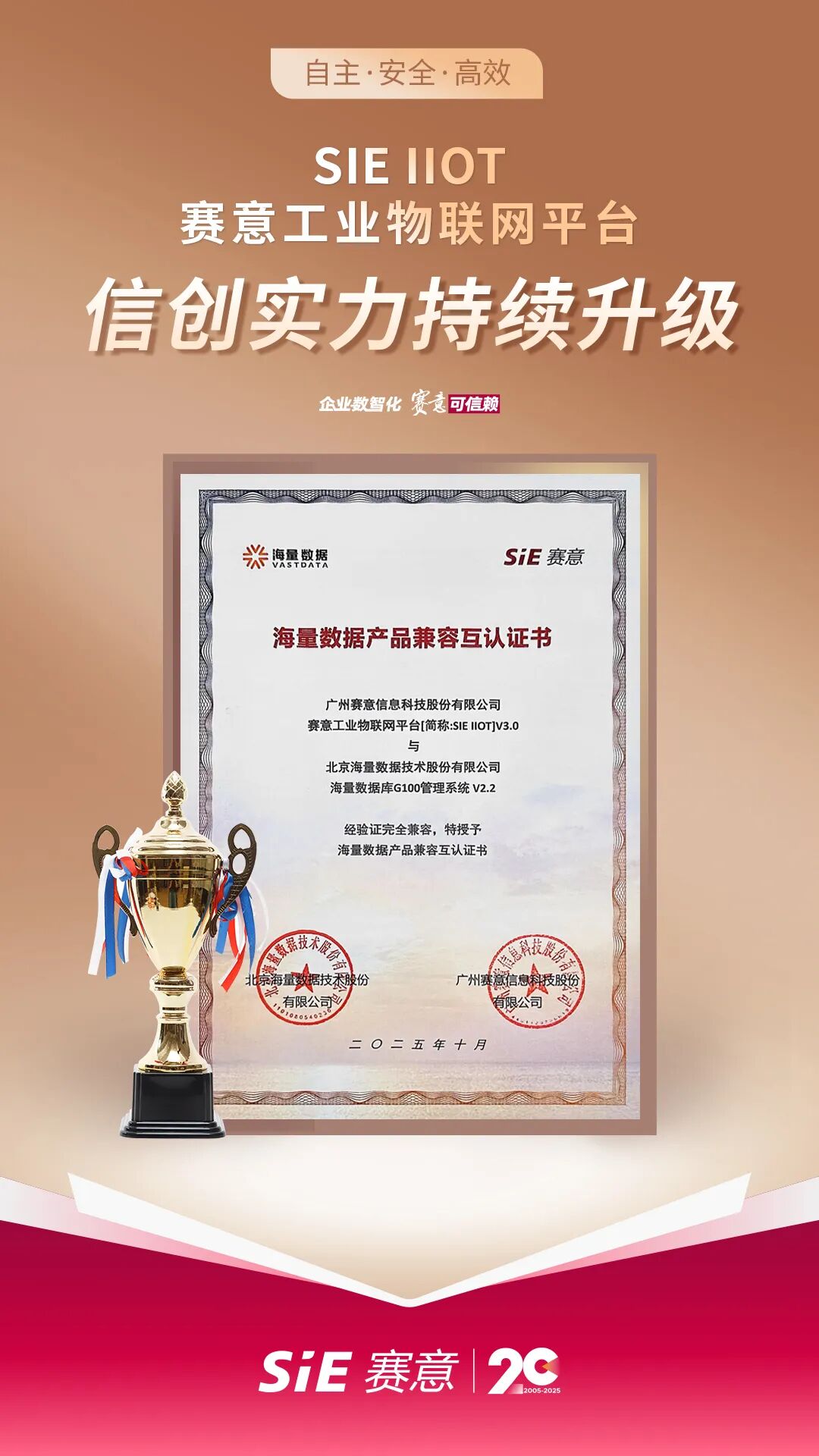 近日,赛意工业物联网平台[简称:SIE IIOT]V3.0顺利通过海量数据信创产品兼容认证。经过双方联合严格测试,赛意IIOT产品能够与海量数据库G100管理系统V2.2、Vastbase G100V3.0系统版本实现完全兼容,整体运行稳定高效,在功能、性能及兼容性方面表现优异,可充分满足工业企业在不同使用场景下的业务需求。