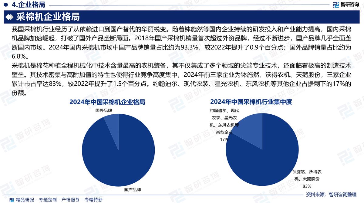 采棉机是采摘棉花的专用收获机械,其工作原理是利用高速旋转的摘锭缠绕花絮,使棉花从壳中被缠绕抓出,通过脱棉盘将棉花从摘锭上剥落,最后利用气流将脱落的棉花输送至棉箱集中,完成棉花的采获。棉花在我国国民经济中占有重要的地位,尤其是入世20多年来实现了跨越式的发展,我国成为世界棉花的生产、消费大国。国家统计局数据显示,2024年全国棉花总产量616.4万吨,比2023年增加54.6万吨,增长9.7%。受农时、气候、天气等多方面因素限制,棉花收获具有短时集中的特点,传统人工采摘效率低、成本高,难以满足农艺、农时的需求。随着农业现代化的不断推进,机械化技术在棉花生产中的应用越来越广泛。2023年国内棉花机采价格的下降使机主收益降低,新机主对未来市场盈利产生一定担忧,购机持观望态度,导致2024年客户购机热情骤减、需求减弱。此外,国三产品透支、国四产品顾虑等影响因素仍然存在,也使得2024年客户购置采棉机的意愿明显不足。以上因素使2024年国内采棉机市场销量出现下降。根据中国农业机械工业协会统计,2024年我国国内采棉机市场销量约400台,同比大幅下降。我国采棉机行业经历了从依赖进口到国产替代的华丽蜕变。随着钵施然等国内企业持续的研发投入和产业能力提高,国内采棉机品牌加速崛起,打破了国外产品垄断局面。2018年国产采棉机销量首次超过外资品牌,经过不断进步,国产品牌几乎全面垄断国内市场。2024年国内采棉机市场中国产品牌销量占比约为93.3%,较2022年提升了0.9个百分点;国外品牌销量占比约为6.8%。采棉机是棉花种植全程机械化中技术含量最高的农机装备,其不仅集成了多个领域的尖端专业技术,还面临着极高的制造技术壁垒。其技术密集与高附加值的特性也使得行业竞争高度集中,2024年前三家企业为钵施然、沃得农机、天鹅股份,三家企业累计市占率达83%,较2022年提升了1.5个百分点。约翰迪尔、现代农装、星光农机、东风农机等其他企业占据剩下的17%的份额。